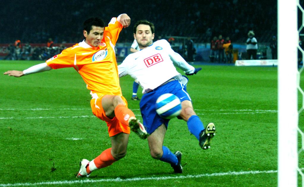 2007年3月16日,在德甲科特布斯队效力的邵佳一(左)在比赛中射门。新华社记者 吴晓凌 摄