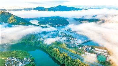 在跨省流域生态补偿机制作用下,新安江流域水质不断改善。图为安徽省歙县深渡镇,新安江山环水绕,云海、青山、村落与跨江公路相映成画。 郑 宏摄(人民图片)